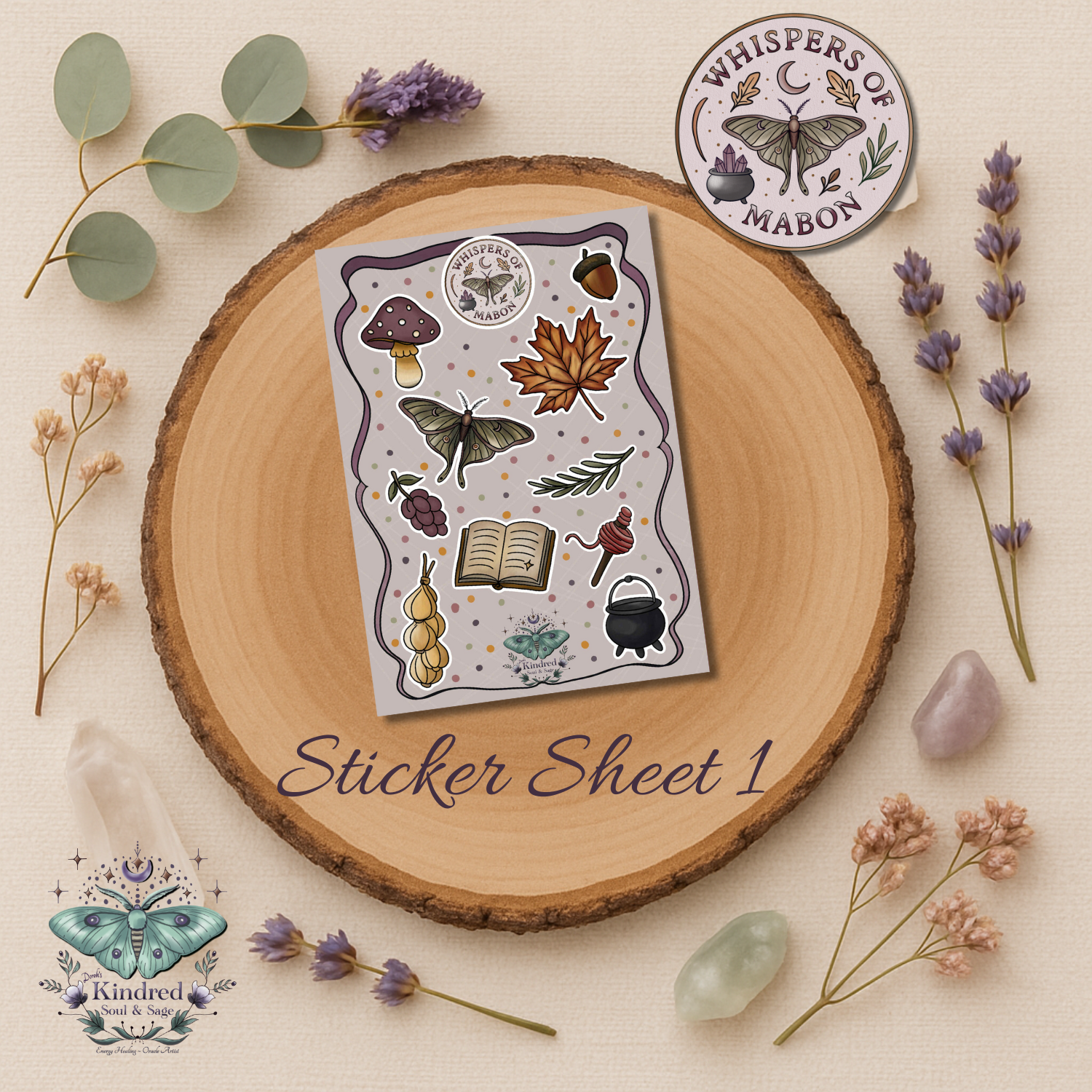 Celebrate the autumn equinox with this enchanting sticker set! The Whispers of Mabon Collection includes two full sheets of decorative stickers and a bonus logo sticker, each inspired by the balance, gratitude, and magic of the harvest season. With hand-illustrated moths, mushrooms, pumpkins, apples, lanterns, crystals, and more, this collection is the perfect way to bring mystical autumn energy into your journals, planners, scrapbooks, and crafts. 🌙✨
